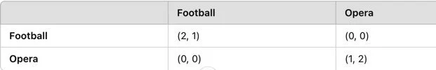 If both choose football, the football-lover receives a payoff of 2, while the opera-lover gets 1 (2, 1).