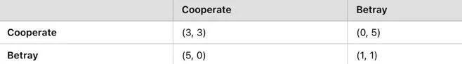 If one betrays while the other cooperates, the betrayer goes free (0 years) while the cooperator serves 5 years (0, 5).