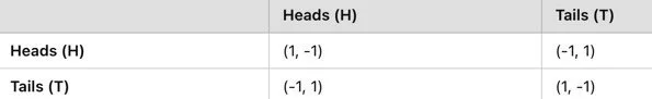 If both choose Heads, Player A gets 1 and Player B gets -1 (A wins).