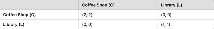 Scenario: Two players, Player A and Player B, need to coordinate their choices between two activities: meeting at a coffee shop (C) or a library (L). Both players prefer to meet at the same place.