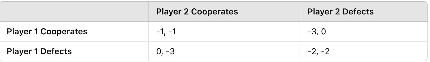 If one defects and the other cooperates, the defector goes free (0), and the cooperator gets a heavy sentence (-3).