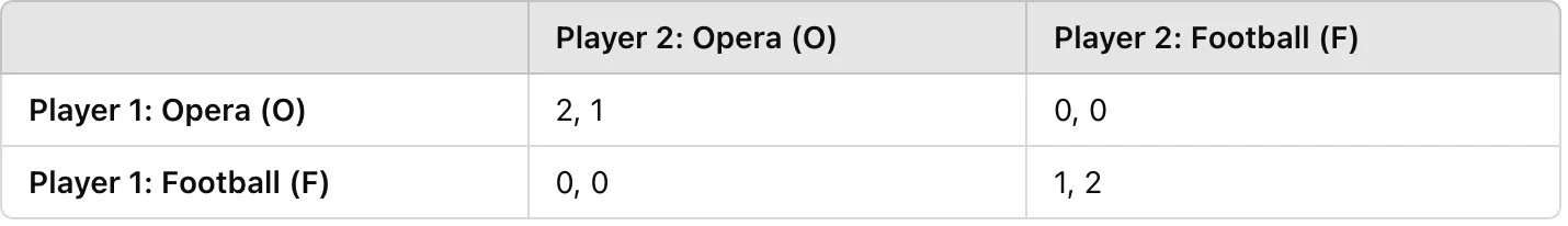 Another classic example is the Battle of the Sexes, where two players—say, a couple—have to decide whether to go to the Opera (O) or to a Football game (F). Both players want to be together, but one prefers the Opera, and the other prefers the Football game. The payoff matrix looks like this: